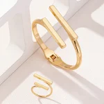 با ست دستبند و انگشتر طلایی مینیمال، استایلی شیک، امروزی و قدرتمند بسازید. طراحی مدرن با خطوط صاف و اشکال هندسی، این ست را به انتخابی منحصربه‌فرد برای بانوانی تبدیل کرده که به دنبال ظاهری متفاوت و چشمگیر هستند.